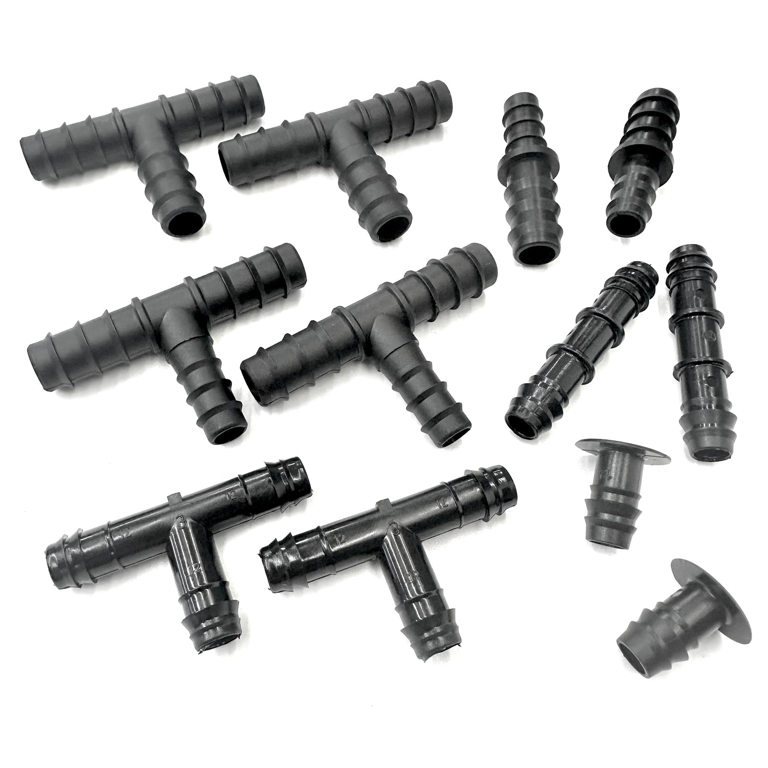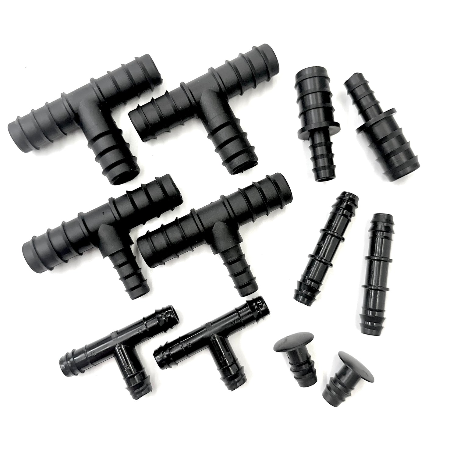A selection pack of 12 barbed fittings which will enable a range of designs to be made up using LeakyPipe and 1/2" garden hose, 16mm or 20mm polytube supply pipe. This pack is suggested to be used with a 50m roll of LeakyPipe in terms of providing a good range and number of fittings that you may want for setting up an irrigation system. If you have 100m roll of LeakyPipe, consider a large selection pack.