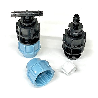 Use these compression fittings where the water is supplied to the garden in 20mm blue MDPE 'mains' pipe. The output end is a barbed fitting which simply pushes onto the LeakyPipe.