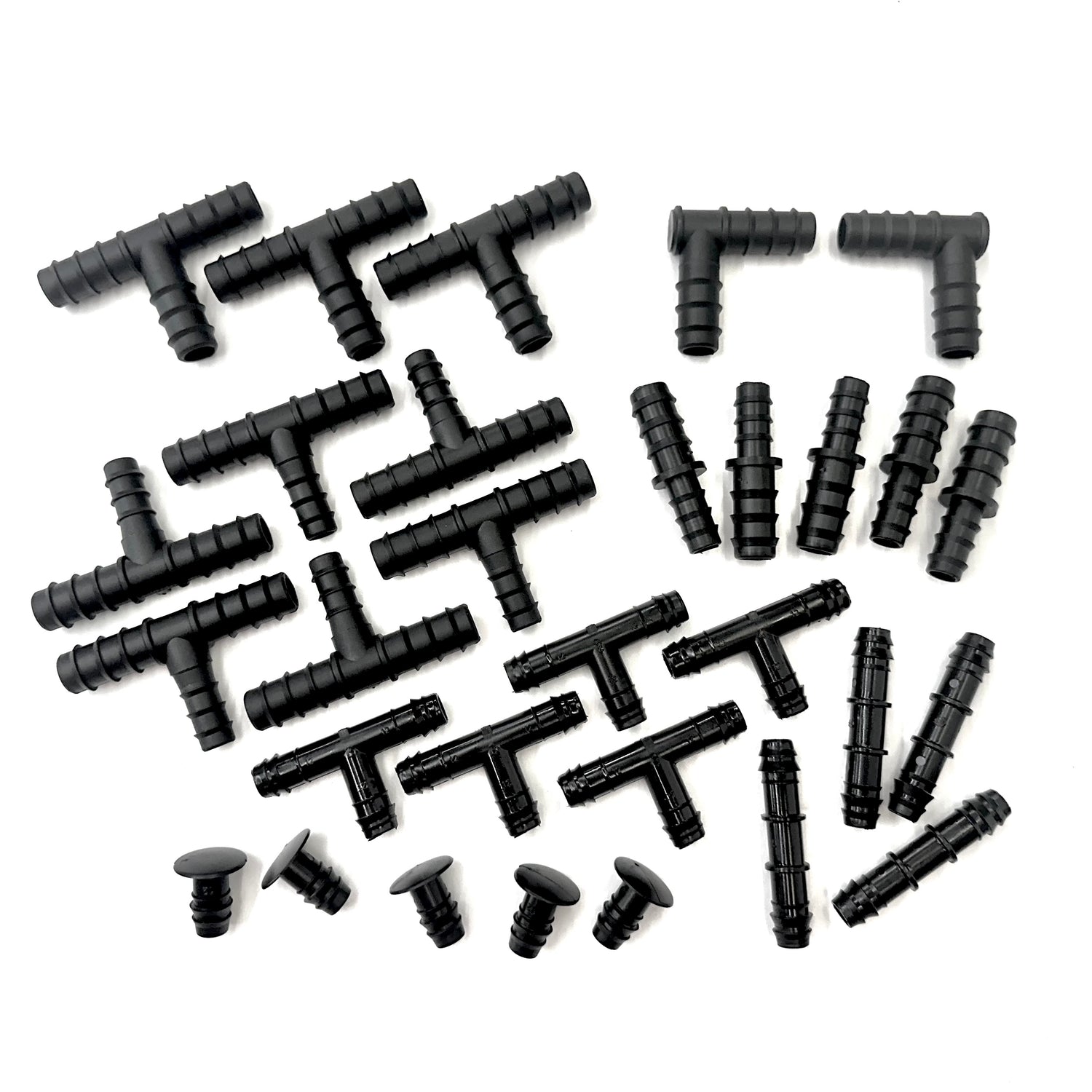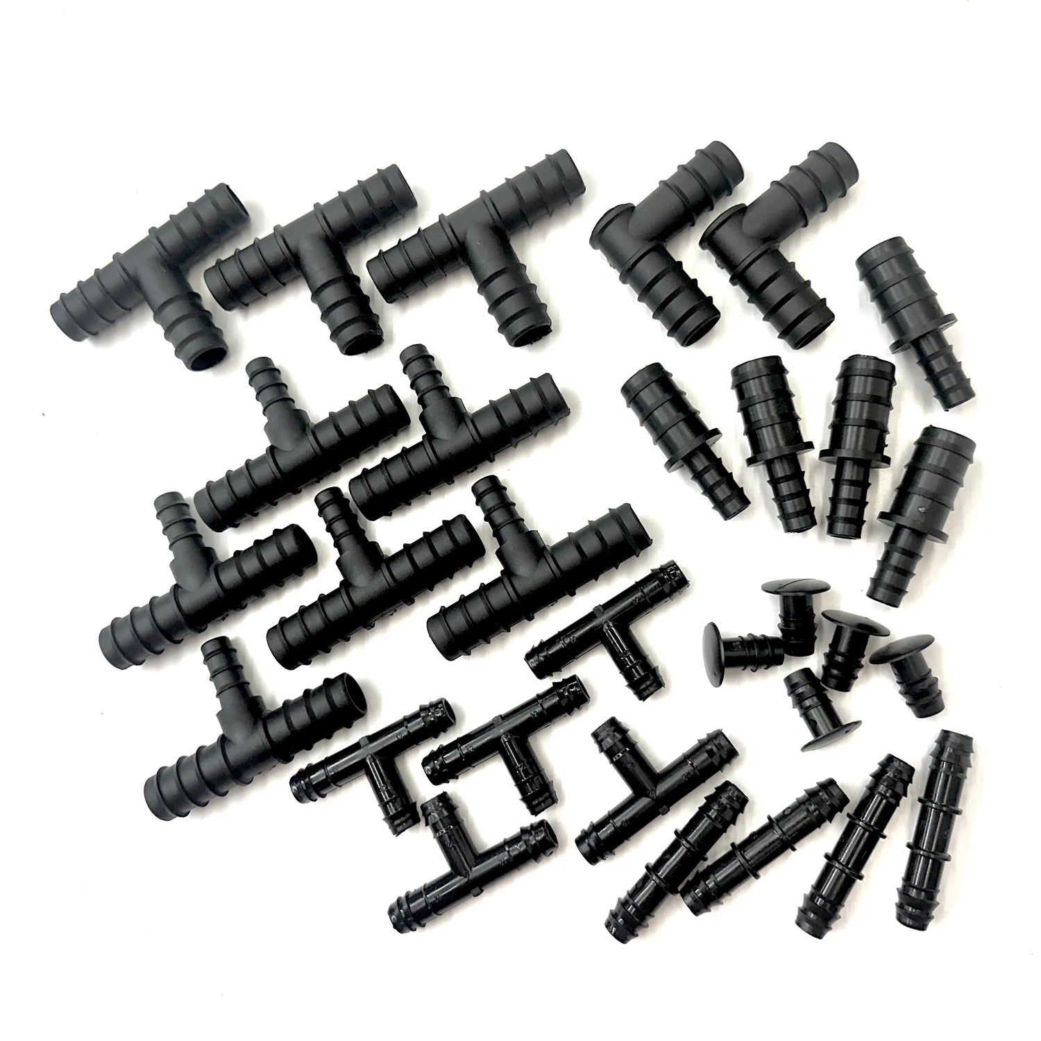 A selection pack of 12 barbed fittings which will enable a range of designs to be made up using LeakyPipe and 1/2" garden hose, 16mm or 20mm polytube supply pipe. This pack is suggested to be used with a 50m roll of LeakyPipe in terms of providing a good range and number of fittings that you may want for setting up an irrigation system. If you have 100m roll of LeakyPipe, consider a large selection pack.