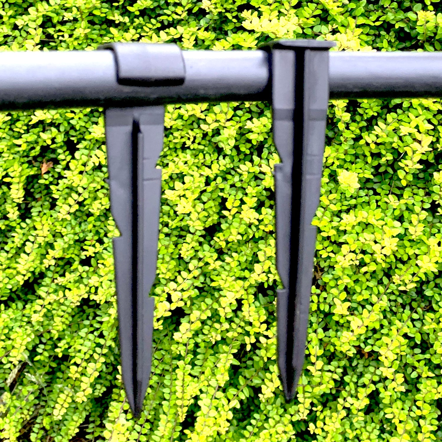 These ground stakes will work if pushed into firm soil. They can be used to hold supply pipe in place, often until further soil is put on top as another means of spotting down the supply pipe.