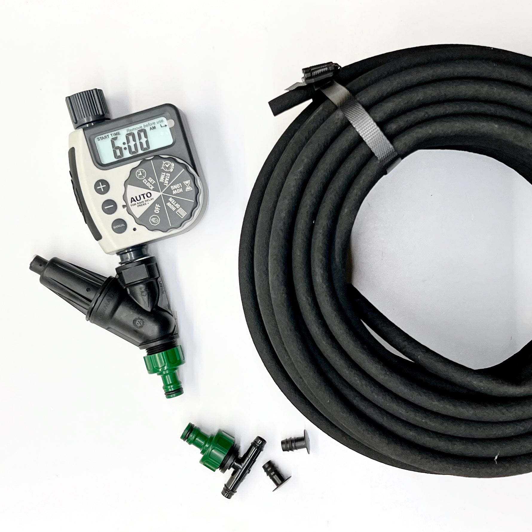 We have put a kit together which meets these requirements. The timer and adjustable pressure reducing valve are preassembled with PTFE tape. The LeakyPipe does not connect direct to the timer/pressure regulator and you will need to provide a short length of hosepipe to carry the water from the timer to the LeakyPipe area. This avoids watering the in-between areas of paths, patios etc, unnecessarily. Hosesnap / Hozelock type fittings are compatible.