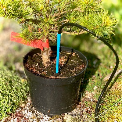 The Spagetti tube is 4mm in diametre and is to discreetly carry the water from the output of the dripper to the hanging basket or patio pot. The stake is to retain the open end of the tube in position when working.  (Detach the stake and jam the pointy end back into the end of the tube, to make a temporary seal).
