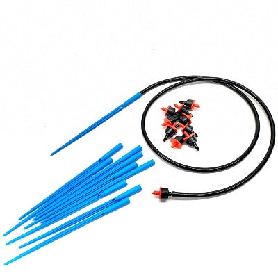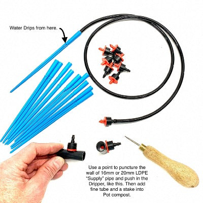 A package containing 10 pressure-compensating button drippers, 10metres of fine "spaghetti" tube and 10 plastic stakes to retain the end of the tube, where you want the drips to fall from. The drippers are for insertion into sidewall of 16mm and 20mm black, LDPE polytubes (and some hosepipes).